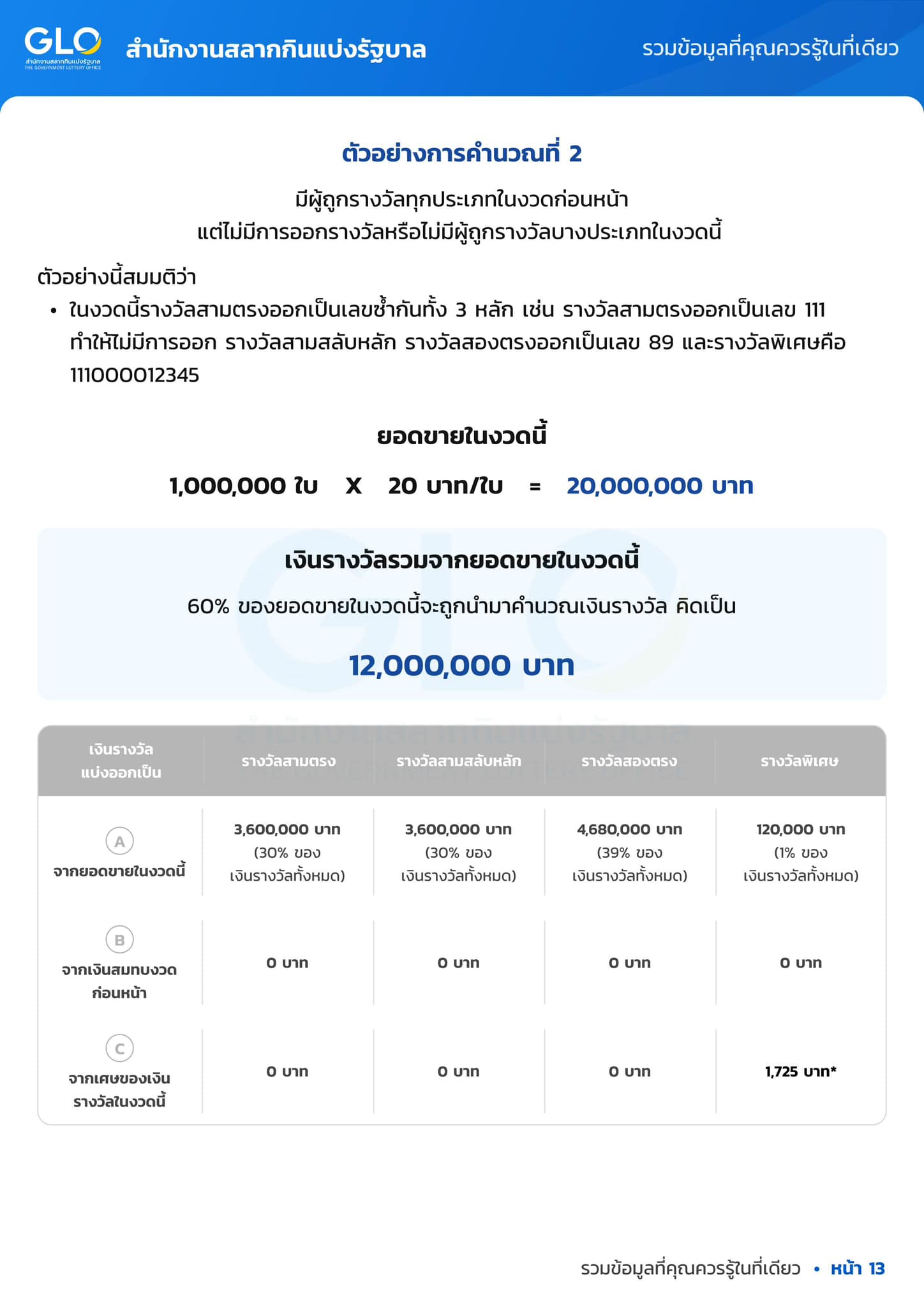 - เมื่อหักค่าดำเนินการตามที่กล่าวมา จะเหลือ 60% ที่เป็นเงินรางวัลทั้งหมด 12 ล้านบาท