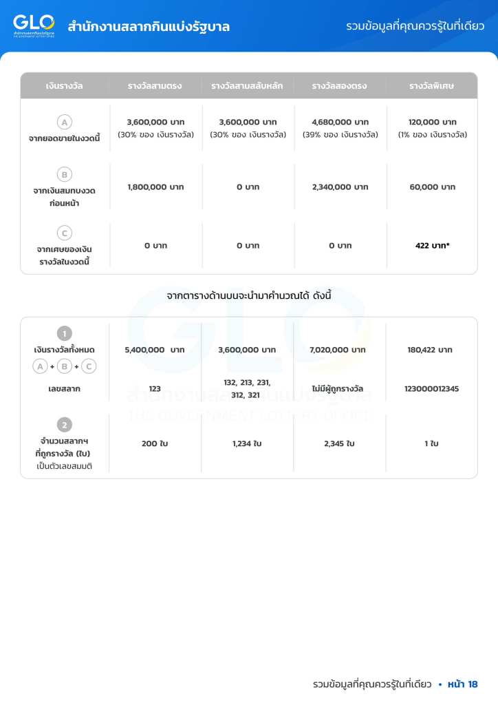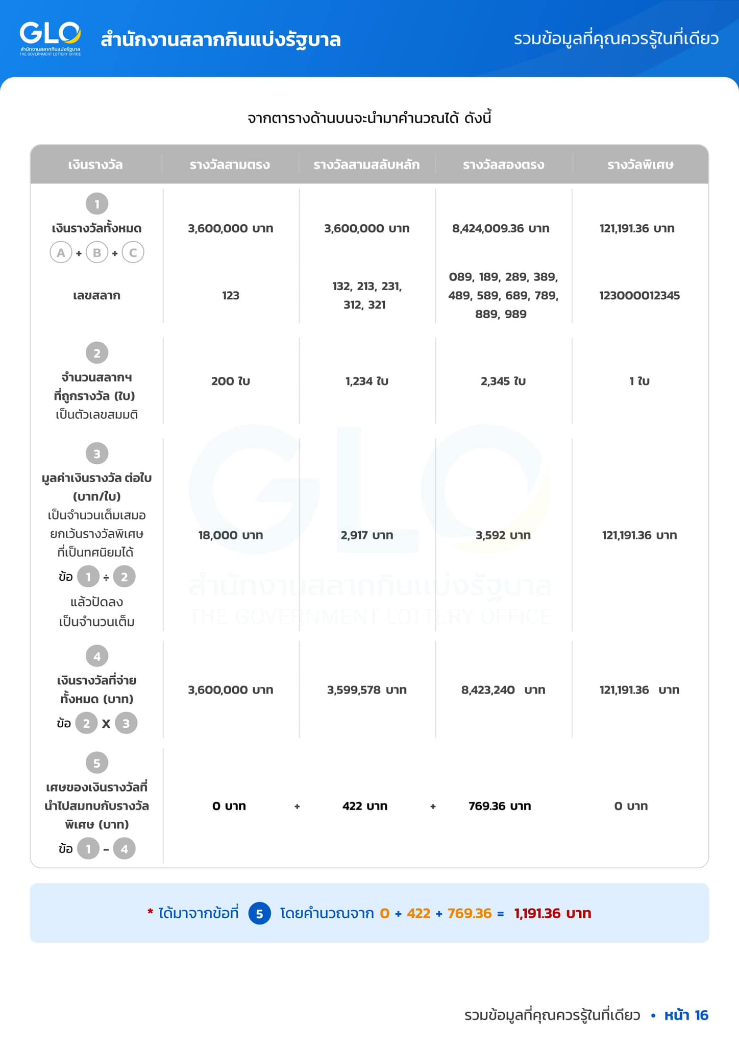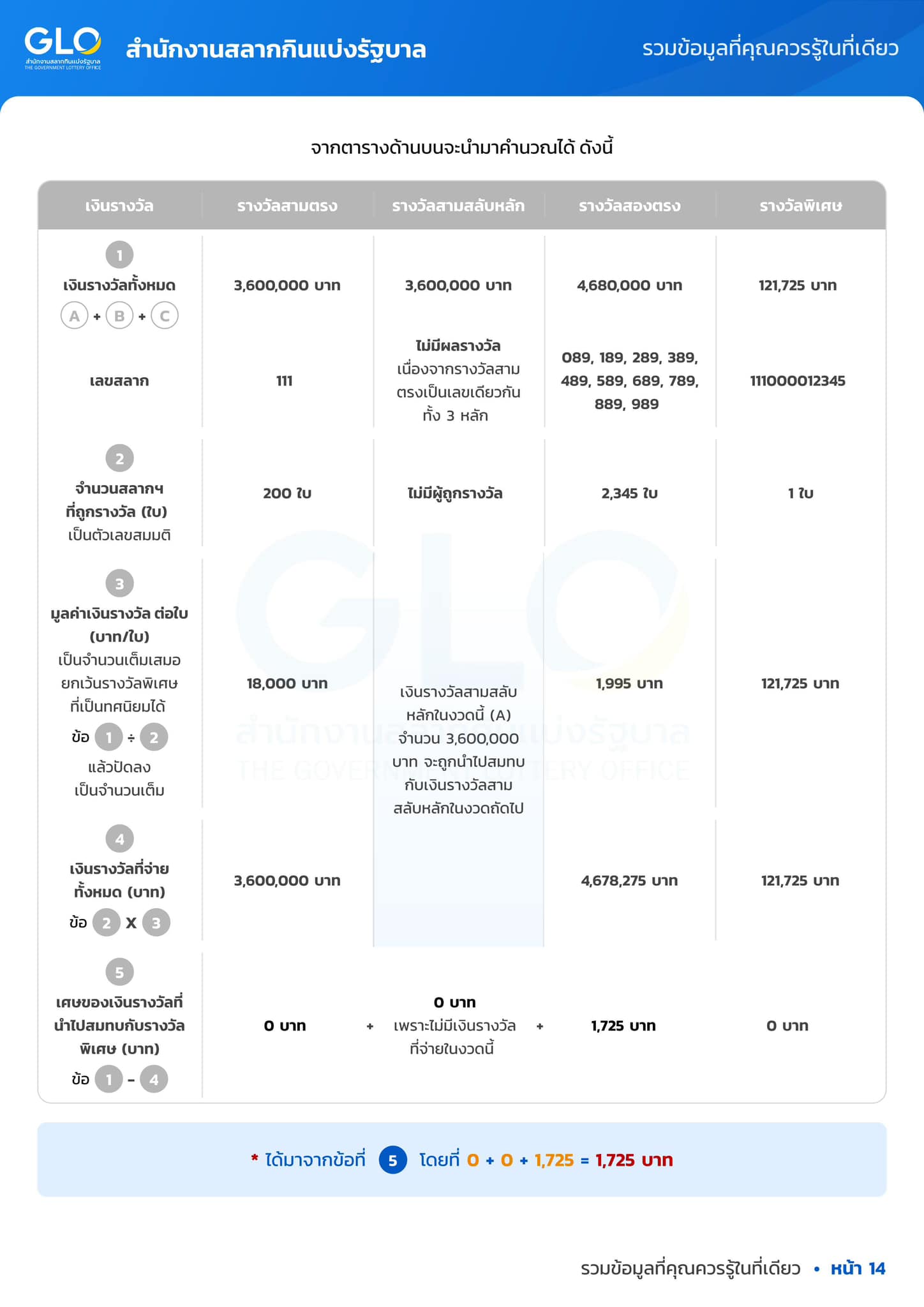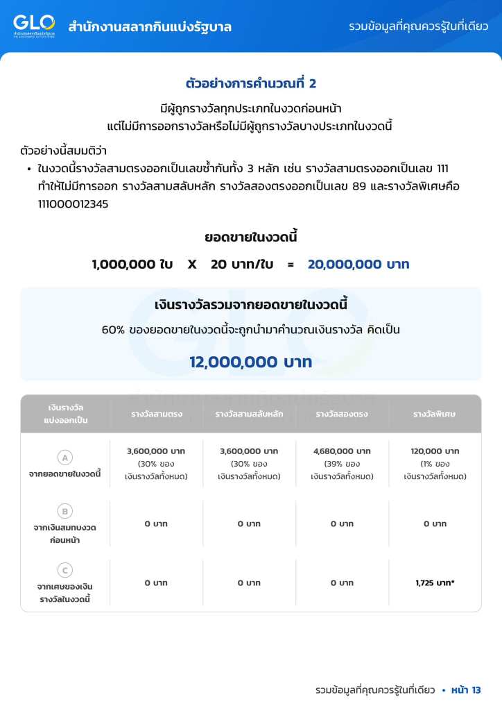 มาคำนวณกับสัดส่วนเงินรางวัลจากยอดขายทั้งหมดในแต่ละช่วง โดยกองสลากก็ได้อธิบายวิธีคำนวณเอาไว้เหมือนกัน แต่ถ้าอ่านแล้วก็มึนๆ นิดหน่อย โดยสามารถดูเนื้อหาต้นฉบับได้ในอ้างอิงท้ายบทความนะคะ