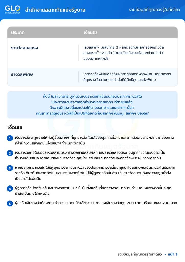 | รางวัลพิเศษ | สัดส่วนเงินรางวัล 1% | จากยอดขายทั้งหมดในแต่ละงวด |