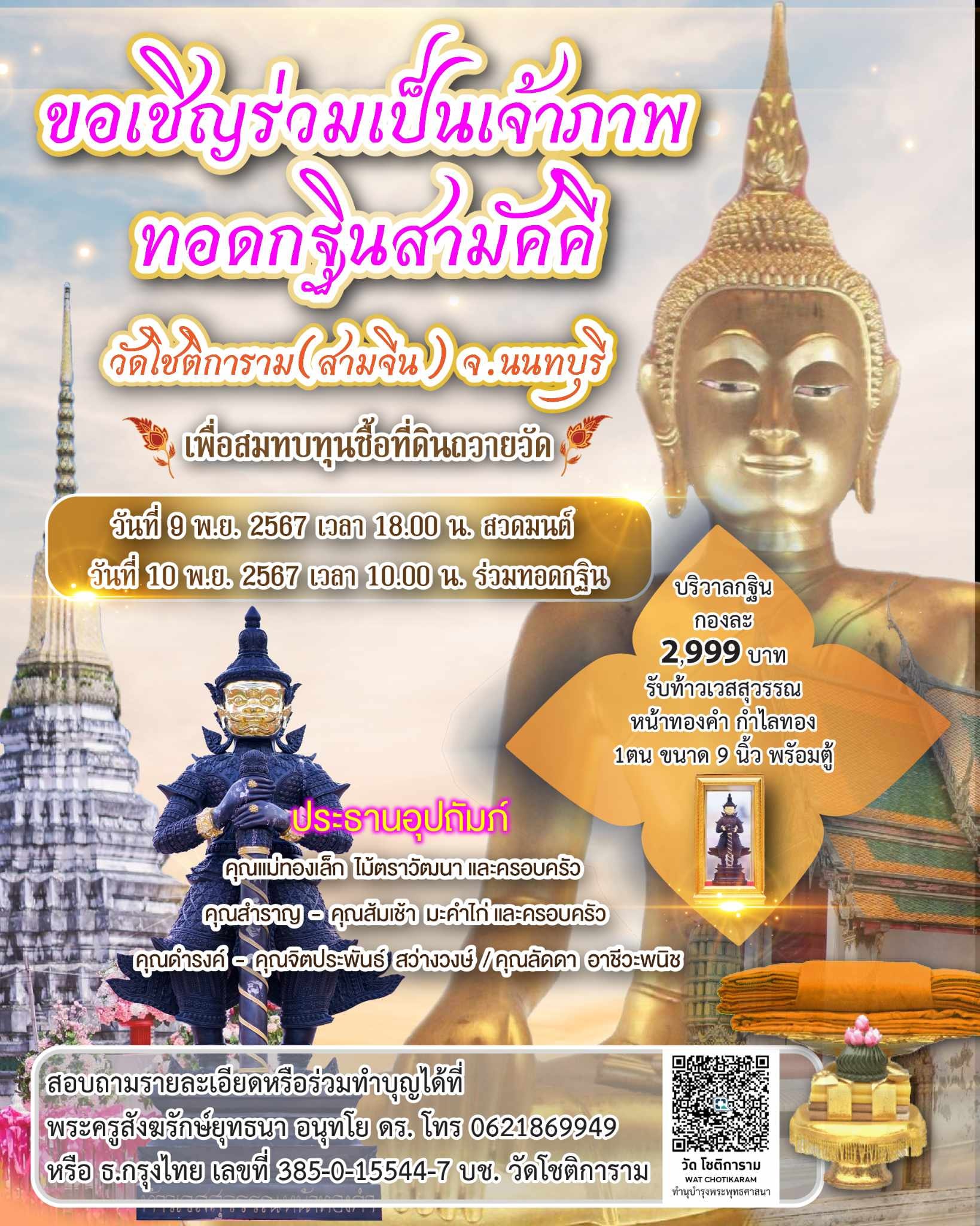 | วัดพิกุลทอง ทอดกฐินวันที่ 10 พ.ย. 2567 09:00 |