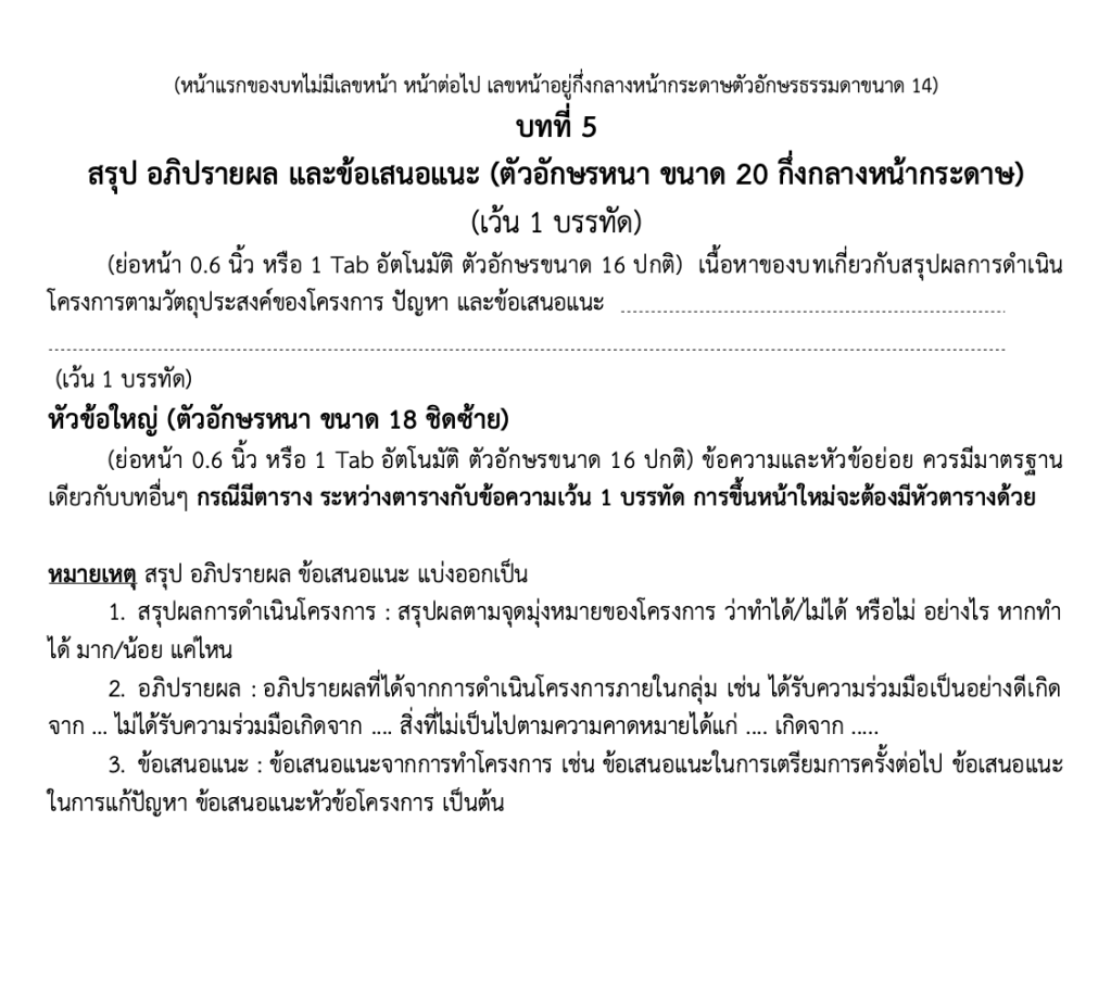 | รายละเอียดรูปเล่มรายงานมัธยมต้น ใช้หลัก 5 ข้อตามที่กล่าวมาข้างต้น แต่หากเป็นรายงานมัธยมศึกษาตอนปลาย แนะนำให้ใช้รูปแบบรายงานที่มีความละเอียดขึ้น ดังนี้ รูปแบบของรายงาน 1. ตัวอักษร:ใช้ตัวอักษรมาตรฐาน ThSarabunPSK ขนาด16 2. กระดาษ : ขนาด A4 ระยะขอบ ซ้ายและบน 11⁄2 นิ้ว ขวาและล่าง 1 นิ้ว 3. การย่อหน้า : Tab 0.6 นิ้ว ระหว่างหัวข้อใหญ่ เว้น 1 บรรทัด 4. ส่วนประกอบของรายงาน 4.1. ปก 4.2. คำนำ 4.3. สารบัญ 4.4. สารบัญตาราง 4.5. สารบัญภาพ 4.6. เนื้อหา – บทที่ 1 ความเป็นมาและความสำคัญของปัญหา – บทที่ 2 เอกสารและงานวิจัยที่เกี่ยวข้อง – บทที่ 3 วิธีดำเนินโครงการ – บทที่ 4 ผลที่ได้รับจากการดำเนินโครงการ – บทที่ 5 สรุป อภิปรายผล และข้อเสนอแนะ – บรรณานุกรม – ภาคผนวก 1 โครงการ – ภาคผนวก 2 เอกสารการติดต่อหน่วยงานที่เกี่ยวข้อง – ภาคผนวก3 (นักศึกษาสามารถกำหนดเองได้) 5. เอกสารประกอบอื่นๆ เช่น แผนที่ หรือ Prototype แปลนสิ่งประดิษฐ์ |