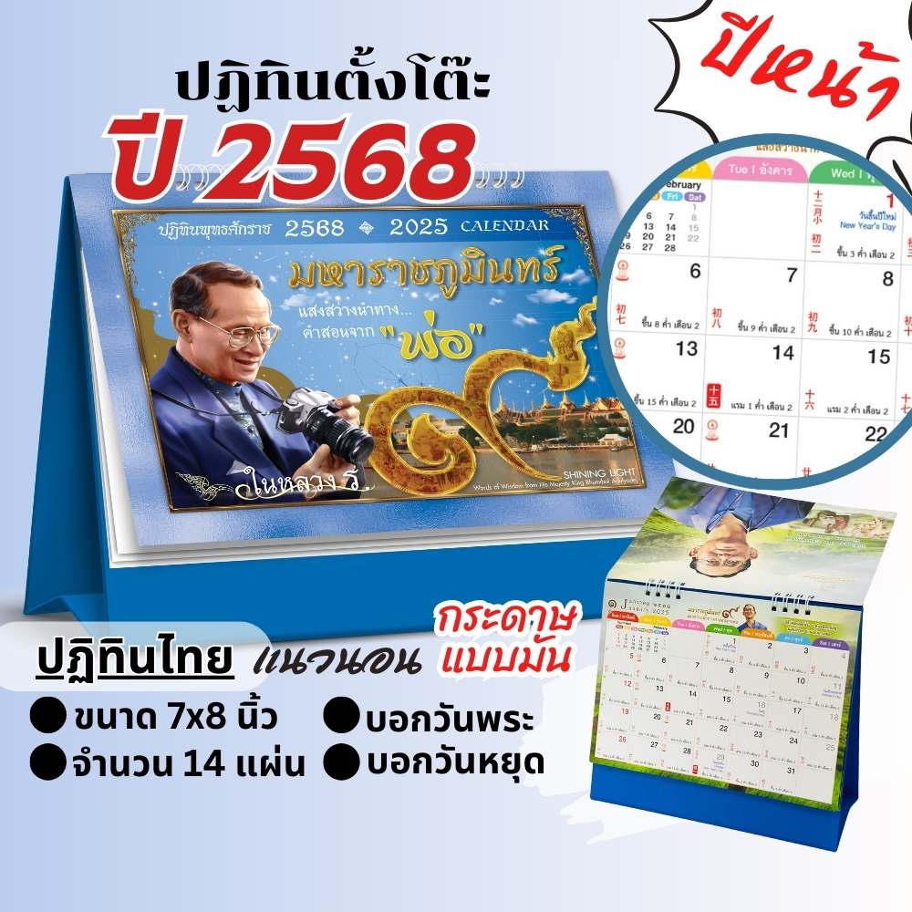 ปฏิทินตั้งโต๊ะ ชุดในหลวง ร.9 กระดาษมัน ขนาด 6×8 นิ้ว พิมพ์ด้วยกระดาษอาร์ตการ์ด 230 แกรม หุ้มด้วยกระดาษปอนด์ มี 14 แผ่น 28 หน้า พร้อมโปสการ์ด เหมาะสำหรับแจกลูกค้า เพื่อนร่วมงาน ราคา 59 บาท  คลิกสั่งซื้อที่นี่