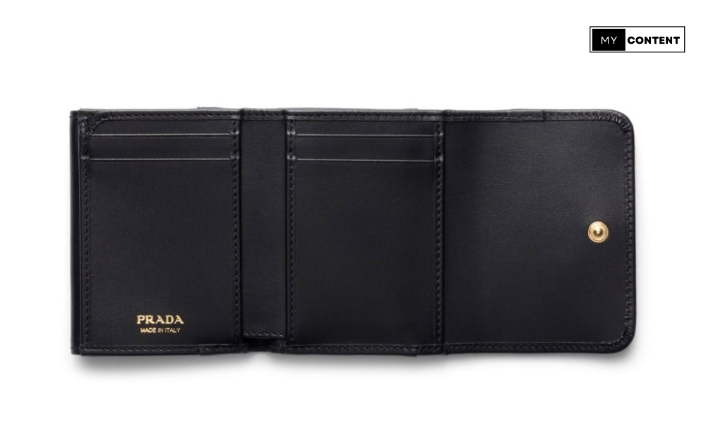 กระเป๋าสตางค์แบรนด์เนมสีดำจาก Prada ทำจากหนัง Saffiano ที่มีความทนทาน มาพร้อมโลโก้สามเหลี่ยมสีเงินด้านหน้า - ราคา: ประมาณ 18,000 บาท (ดูสินค้าได้ที่ SHOPEE | LAZADA)