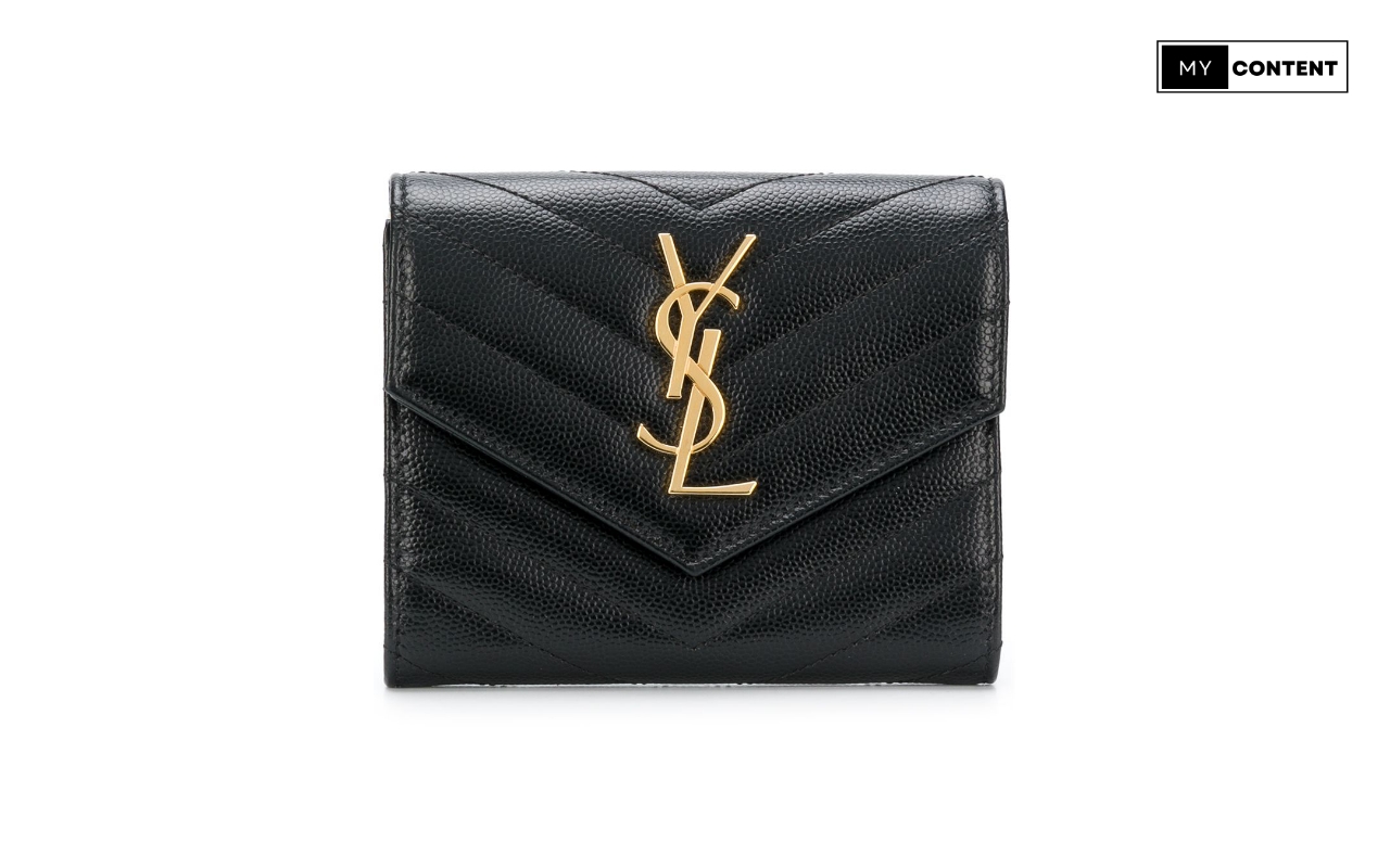 กระเป๋าสตางค์แบรนด์เนมสีดำ ใบเล็ก หนังแท้ แบรนด์ Saint Laurent ทำจากหนังลูกวัว (Calfskin) สีดำ มาพร้อมโลโก้ YSL ด้านหน้า - ราคา : ประมาณ 15,000 บาท (จากราคาปกติ 20,000 บาท SHOPEE | LAZADA)