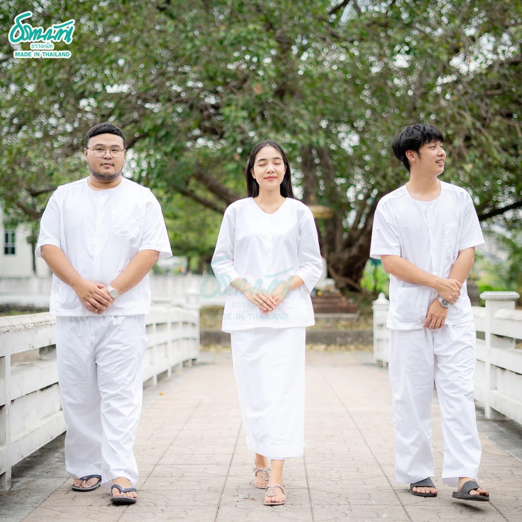 - กางเกงหรือกระโปรงสีขาว: ควรเป็นแบบที่สวมใส่สบาย เช่น ผ้าฝ้ายหรือผ้าลินิน เพื่อให้นั่งสวดมนต์ได้สะดวก