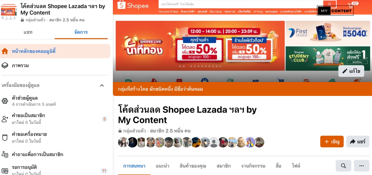 ตัวอย่างเพจ Mycontent-thai.com ของเราก็มีกลุ่ม Facebook ไว้รวม Community พูดคุยเรื่องโค้ดกันค่ะ