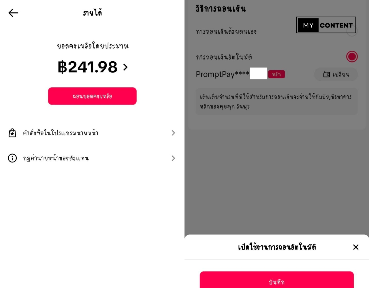 - กดคำว่า “การถอนเงิน” เพื่อเปิดใช้งานการถอนเงินด้วยตัวเอง หรือการถอนเงินอัตโนมัติ ด้วยการใส่หมายเลขบัญชี, TrueMoney หรือ PromptPay หลังจากนั้นหากไม่ได้มากดถอนเงินด้วยตัวเอง เงินจะเข้าบัญชีธนาคารหลักหรือพร้อมเพย์ของคุณทุกวันพุธ หากกลัวลืมก็สามารถกด “เปิดใช้งานการถอนอัตโนมัติ” ไว้ได้