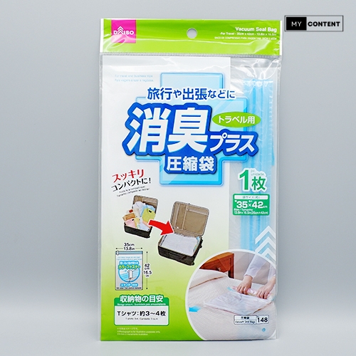 ถุงสูญญากาศจาก Daiso เหมาะสำหรับใส่เสื้อผ้าขนาดเล็ก เช่น เสื้อยืด กางเกงขาสั้น หรือชุดชั้นใน เหมาะกับเสื้อผ้าชิ้นเล็กๆ ใช้งานง่าย ไม่ต้องใช้เครื่องดูดฝุ่น