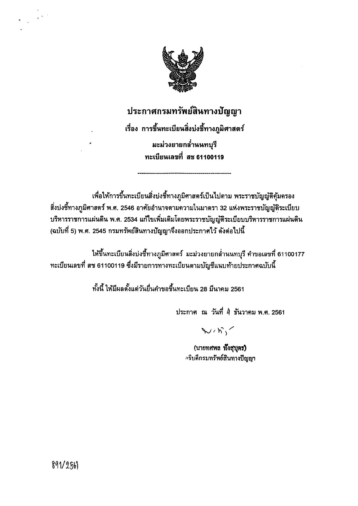 ต่อมามีโอกาสที่ชาวบ้านได้นำ “มะม่วงยายกล่ำ” ทูลเกล้าฯ ถวายสมเด็จพระเทพฯ ทรงรับสั่งให้รักษาพันธุ์มะม่วงไว้ และเมื่อครั้งน้ำท่วมใหญ่ปี พ.ศ. 2554 ได้ทำให้ต้นมะม่วงจำนวนมากได้รับความเสียหายล้มตาย จึงยิ่งทำให้ “มะม่วงยายกล่ำ” หารับประทานยากขึ้นไปอีก ในปี พ.ศ. 2561 จังหวัดนนทบุรีจึงได้จดทะเบียน “มะม่วงยายกล่ำ” เป็นสิ่งบ่งชี้ทางภูมิศาสตร์ เลขทะเบียน 61100119 ลงวันที่ 28 มีนาคม 2561 โดยการขึ้นทะเบียนครั้งนี้ทำให้มีการจัดระบบบอกที่มา และบรรจุหีบห่อ ให้ผู้สั่งซื้อได้ทราบถึงที่มา และชื่อสายพันธุ์
