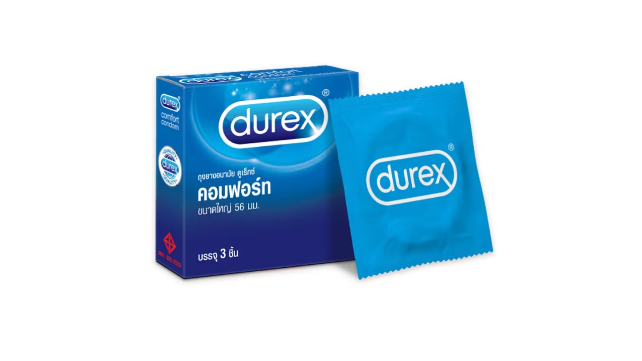 ถุงยางอนามัยดูเร็กซ์ คอมฟอร์ต (Durex Comfort) กล่องใหญ่ 10 ชิ้น กล่องใหญ่ ผิวเรียบ มีสารหล่อลื่นในตัว ขนาดเส้นรอบวงสูงสุด 56 มม. ผิวสัมผัสผนังไม่ขนาน มีกระเปาะ ไม่เจือสี เลขจดทะเบียนใบอนุญาตเครื่องมือแพทย์เลขที่: ผ.60/2549