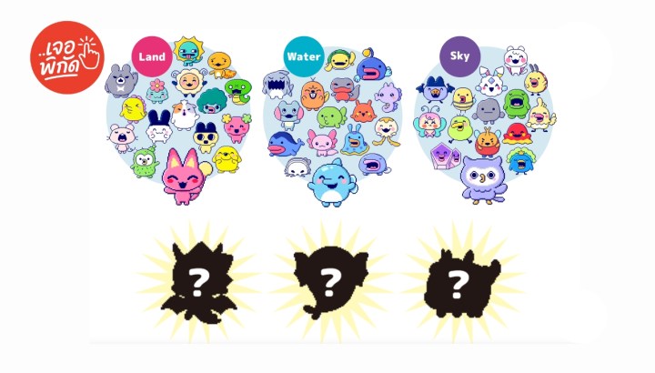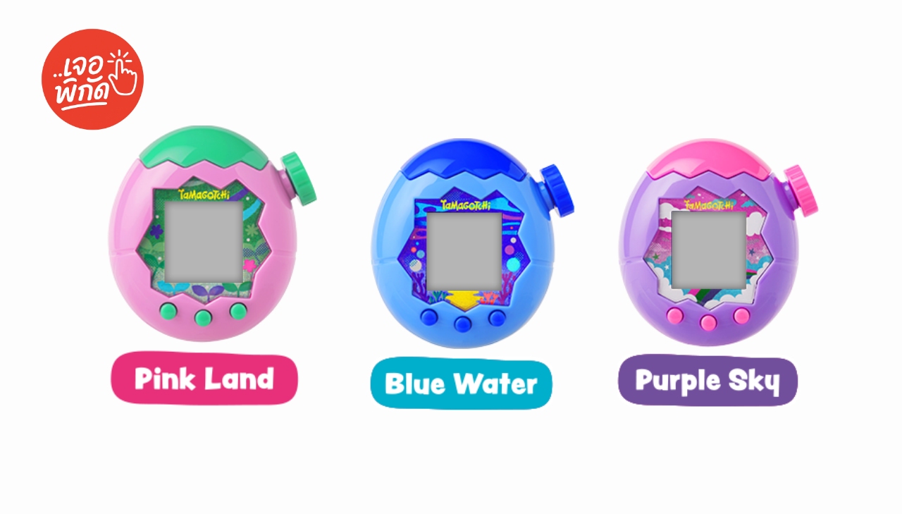ใส่ถ่าน AAA เปิดเครื่อง แล้วกด Zoom Dial (ปุ่มหมุนด้านข้าง) เพื่อเริ่ม “Egg Bang” – เหตุการณ์ไข่ระเบิดที่ถือกำเนิด New Tamagotchi Planet ของคุณทันที จากนั้น ระบบจะทำหน้าที่สุ่มฟิลด์เริ่มต้นให้คุณ: Land, Water, หรือ Sky ขึ้นอยู่กับสีของเครื่องที่ใช้ ดังนี้