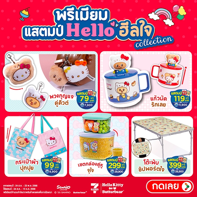 - แลกของพรีเมียม – ปีนี้ (2568) มีคอลเลกชัน Hello ฮีลใจ คิตตี้ x หมีเนย เช่น พวงกุญแจ กระเป๋าผ้า แก้วน้ำ เซตกล่อง โต๊ะพับ