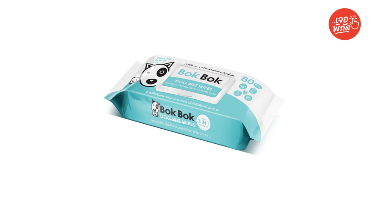 Bok Bok Dog Wipes สูตรอ่อนโยนที่ระบุว่า สามารถเช็ด ตา หู จมูก และปากสุนัขได้ อย่างปลอดภัย เหมาะสำหรับสุนัขที่ผิวบอบบางเป็นพิเศษ