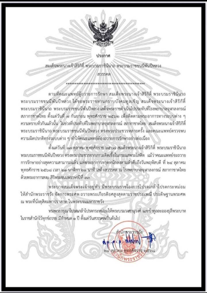 สำนักพระราชวัง ได้ออกประกาศเรื่อง สมเด็จพระนางเจ้าสิริกิติ์ พระบรมราชินีนาถ พระบรมราชชนนีพันปีหลวง สวรรคตสร้างความโทมนัสแก่พสกนิกรชาวไทยอย่างยิ่ง