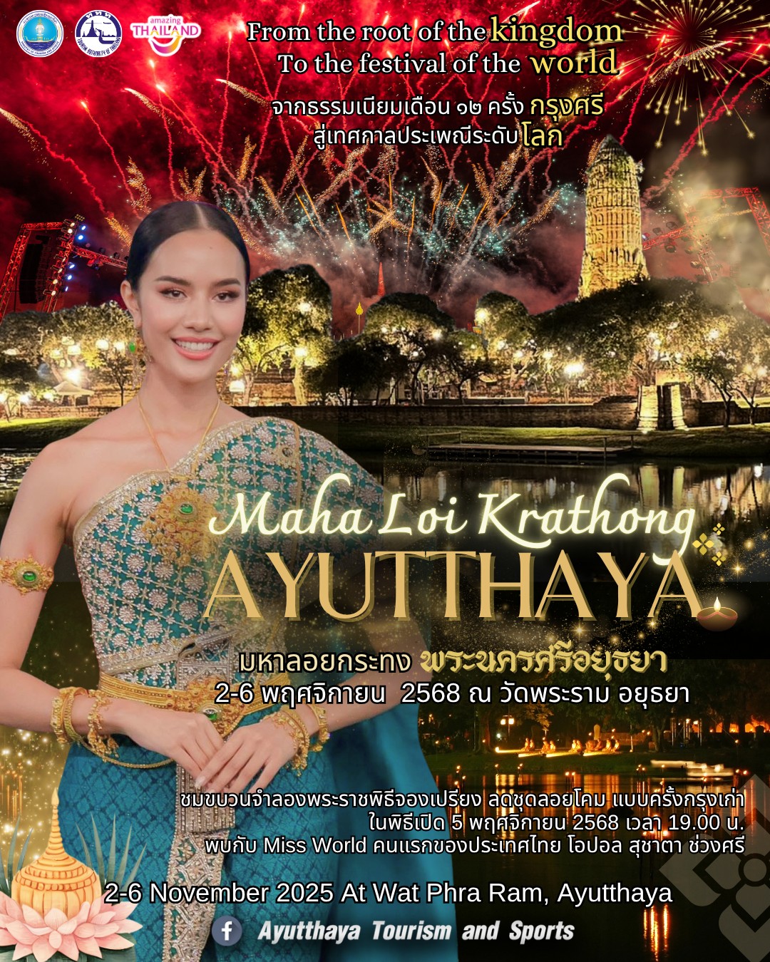 ในทุกปีเมื่อถึงคืนวันเพ็ญเดือนสิบสอง เสียงเพลงแห่งสายน้ำและแสงไฟจากกระทงนับพันจะกลับมาส่องประกายทั่วทั้งประเทศ และหนึ่งในสถานที่ที่งดงามและมีเอกลักษณ์ที่สุดก็คือ จังหวัดพระนครศรีอยุธยา เมืองหลวงเก่าแห่งอารยธรรมไทย ที่ยังคงอนุรักษ์ประเพณีลอยกระทงไว้อย่างวิจิตรและเปี่ยมด้วยความหมายทางวัฒนธรรม ปีนี้ “Maha Loi Krathong @Ayutthaya – มหาลอยกระทง พระนครศรีอยุธยา 2568” ถูกจัดขึ้นอย่างยิ่งใหญ่ ระหว่างวันที่ 2 – 6 พฤศจิกายน 2568 ณ วัดพระราม อุทยานประวัติศาสตร์พระนครศรีอยุธยา