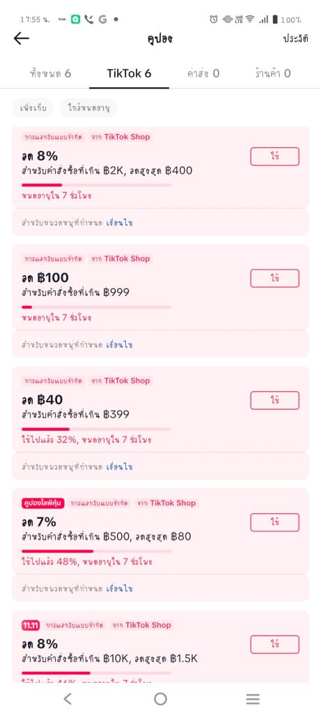- เก็บคูปองหลายระดับ: เก็บทั้งคูปองส่วนลดเป็นเปอร์เซ็นต์ (เช่น 8%, 7%) และคูปองส่วนลดเป็นเงินบาท (เช่น ฿100, ฿40) เพื่อเลือกใช้คูปองที่ให้ความคุ้มค่าสูงสุดกับยอดคำสั่งซื้อที่แตกต่างกัน