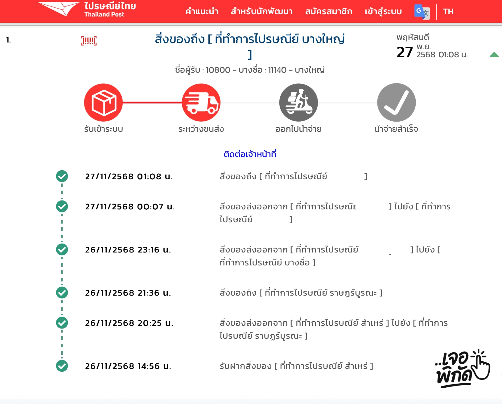 - กดค้นหา: ระบบจะแสดงสถานะล่าสุดของพัสดุ เช่น “รับฝาก”, “อยู่ระหว่างการขนส่ง”, “เตรียมการนำจ่าย” หรือ “นำจ่ายสำเร็จ”