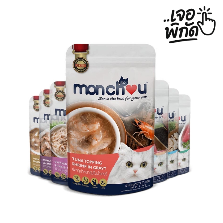 อาหารเปียกแมวยี่ห้อ Monchou (มองชู) แบบซอง ราคาซองละ 20 – 30 บาท อาหารเปียกที่เน้นความอร่อย มีรสชาติแปลกใหม่และเนื้อสัมผัสที่หลากหลาย คลิกสั่งซื้อได้ที่ SHOPEE | LAZADA