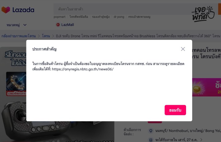 ในการซื้อสินค้าโดรน ผู้ซื้อจำเป็นต้องขอใบอนุญาตลงทะเบียนโดรนจาก กสทช. ก่อน สามารถดูรายละเอียดเพิ่มเติมได้ที่: https://anyregis.nbtc.go.th/news06/
